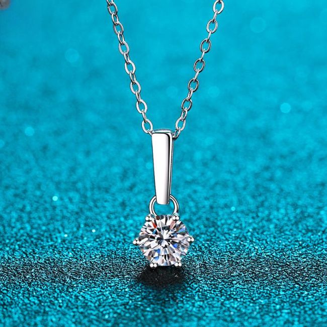 Sterling Silver Plated White Gold Moissanite Six-Prong Pendant Necklace with Simulated Diamond Collar Chain